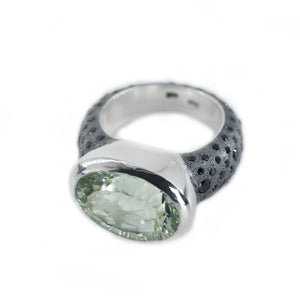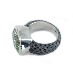 The ring's band is meticulously detailed; its shoulders gleam with natural black spinels, dramatically echoing the glossy, dark feathers of the swift-flying swallow.
